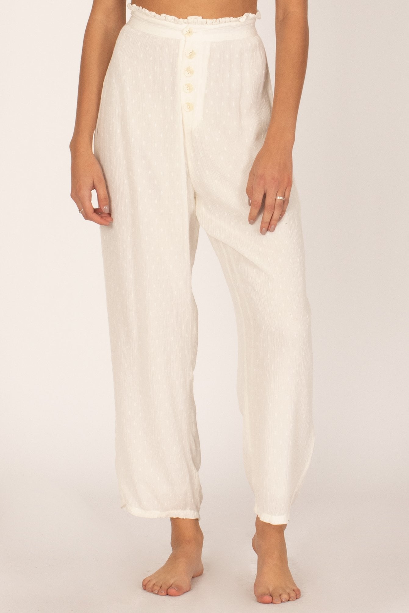 Vacay ready. The Billie Woven Pant features front buttons and a high waist with small ruffle details.