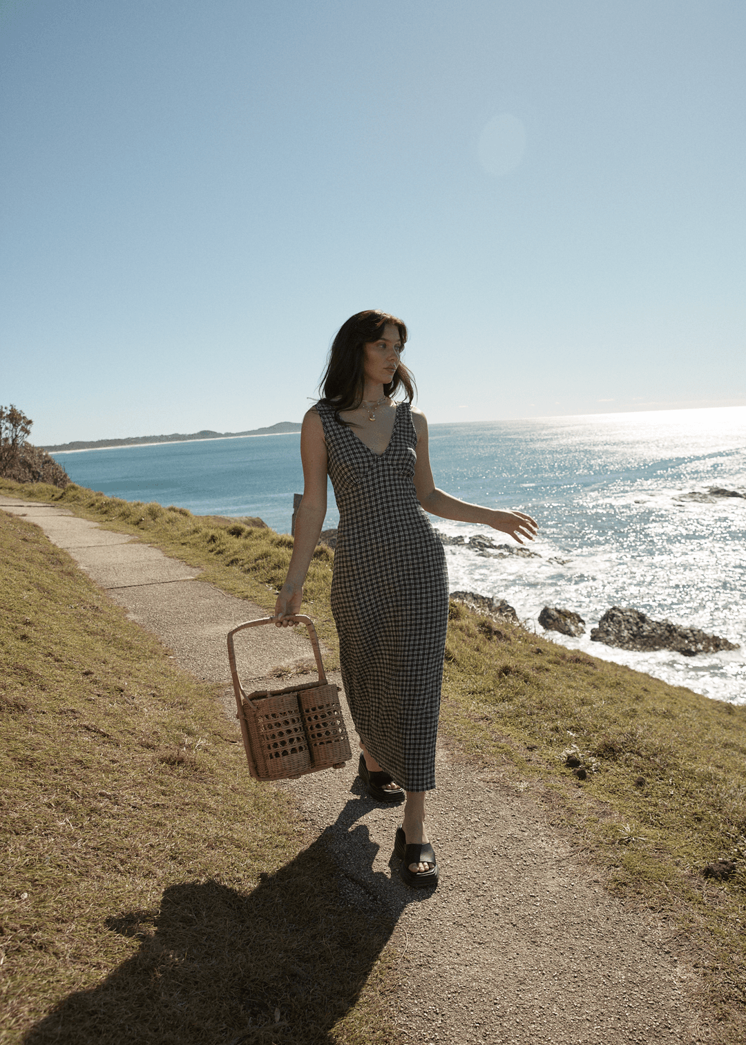 The perfect maxi dress for when you want to slip into something easy. Crafted from an eco-friendly hemp and tencel seersucker blend in a custom black and white check print, this dress offers a lightweight, breathable, and textured hand feel that falls to a flattering length with a v-neckline. Offering a removable waist tie that adjusts to hug your figure. Wear it alone or layer a long sleeve in winter to create the perfect year-round number.