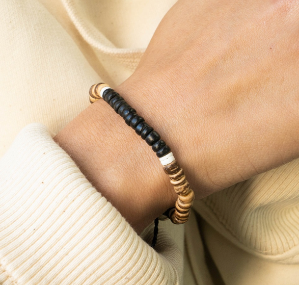 - Made with coloured coconut wood beads strung on a wax polyester cord.