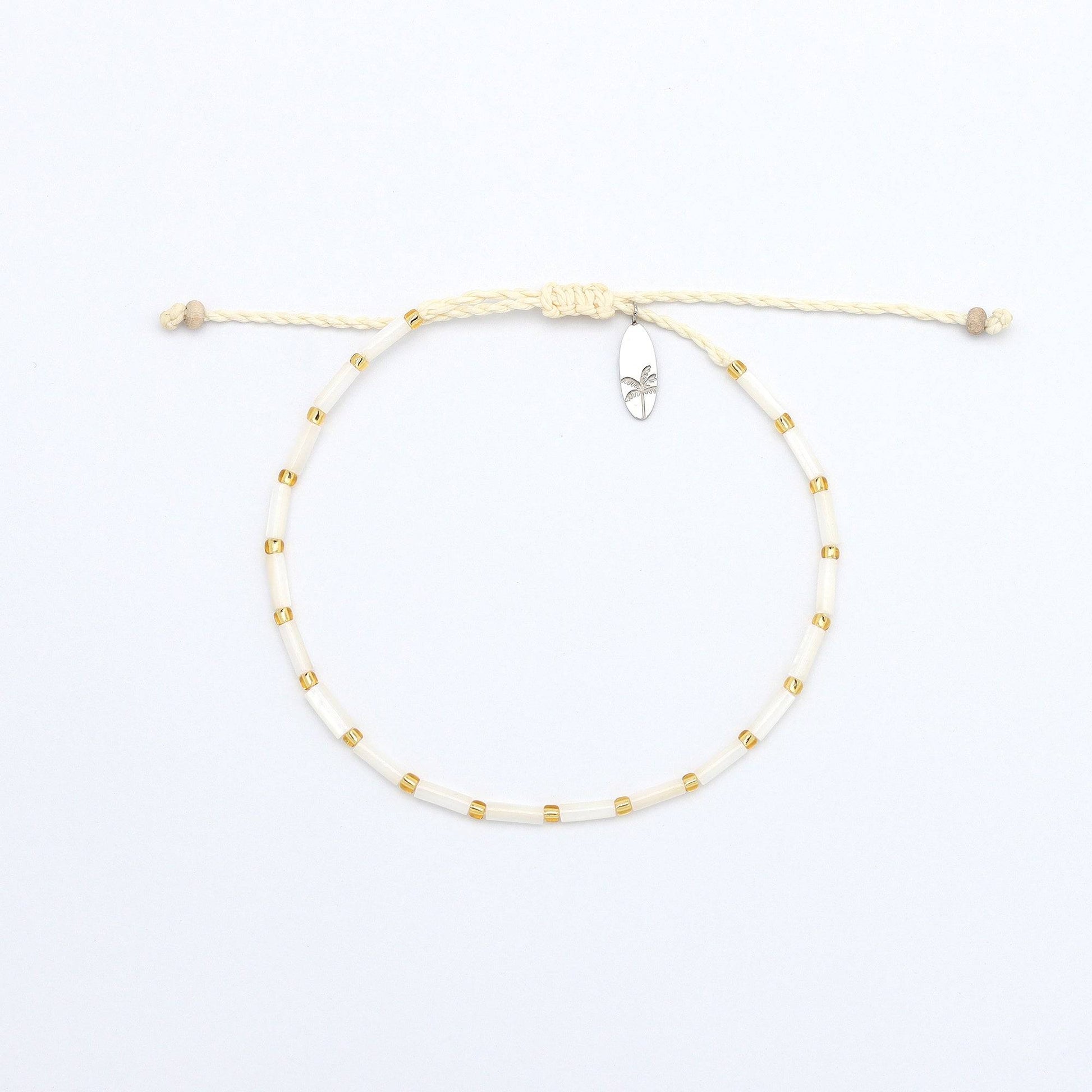 - Made with real mother-of-pearl tube beads, gold-toned glass seed beads, strung on our wax polyester cord and finished with our signature palm tree surfboard charm.