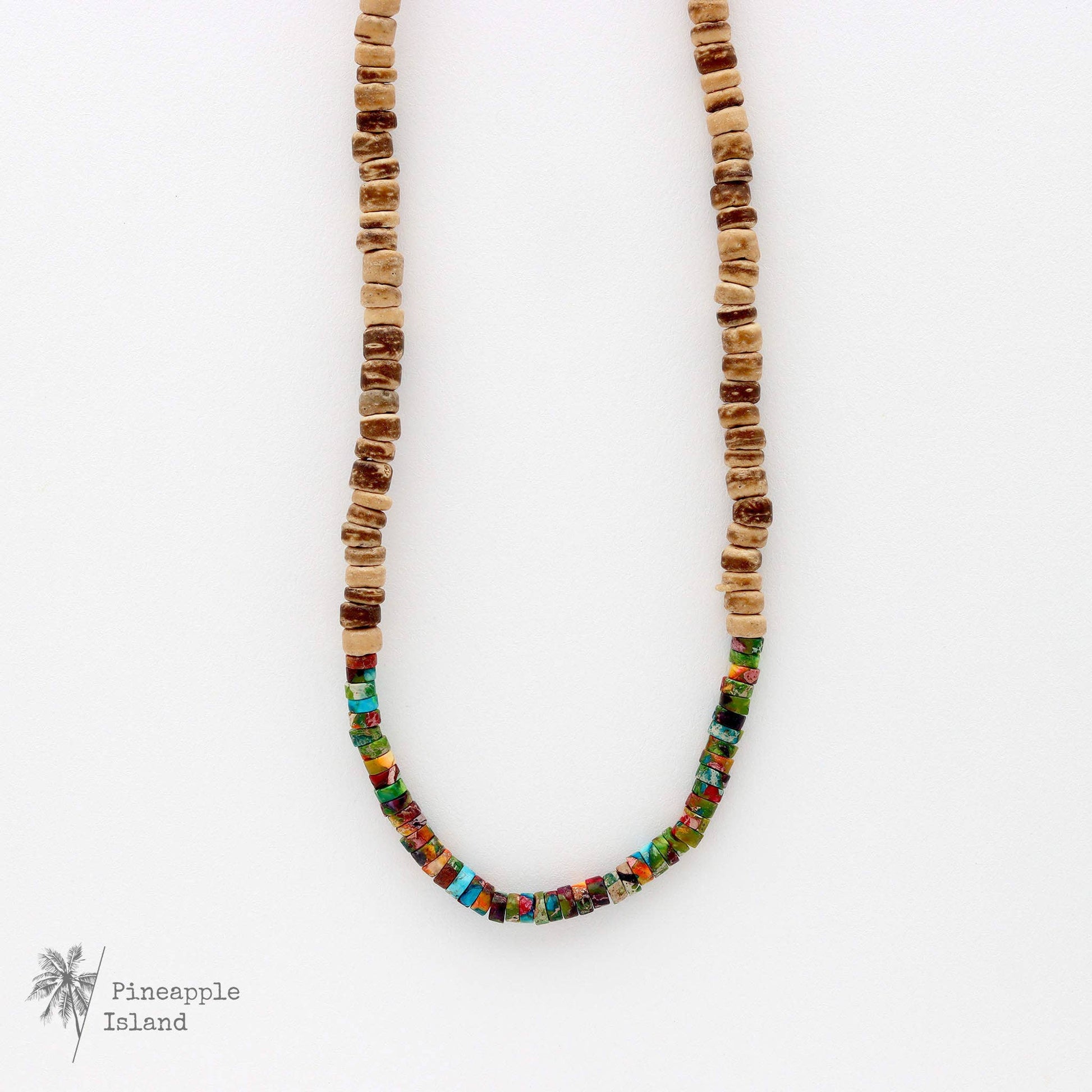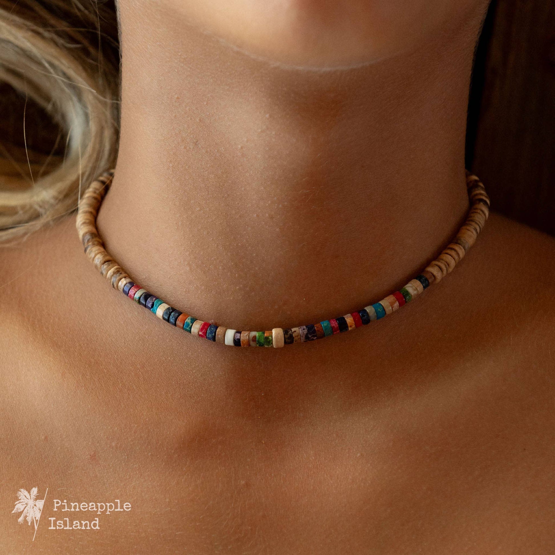 The Koʻolau Wood Beaded Necklace, the perfect combination of wood and colourful natural stone beads! Strung on our durable wax polyester cord so you can take this necklace with you on your adventures through the sand, sea and sunshine! -Made with coloured wood beads & colourful natural stone. -Measures approx. 36cm with a 24cm sliding knot extension. -Handmade in Bali. -Biodegradable or recyclable packaging. -Matching anklet and bracelet available! Our jewellery is handmade in Bali by artisan makers, who have the choice to work and are paid fairly, which makes this the perfect gift for the conscious shopper. Adjustable Necklace, Beaded Necklace, Wood Beaded Necklace, Summer Jewelry, Boho Jewelry, Beach Jewelry, Surf Jewelry, Surf Necklace, Glass Beaded Necklace, Gift For Her, Gift For Him, Gift For Woman, Gift For Men, Gift For Mom, Vacation