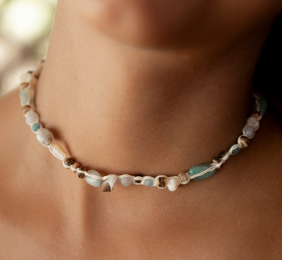 This Balinese beaded choker necklace is handwoven together with natural stones, seeds and sea-glass beads. Perfect as a gift for the ethically-conscious person in your life.