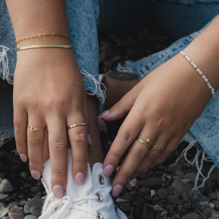 Experience double the style with our Turquoise Stone Double Ring! With an open ring design, this stainless steel ring fits all sizes and features a beautiful turquoise stone that is both waterproof and tarnish-free. Two rings in one, for a unique and versatile accessory. A perfect gift for her!
