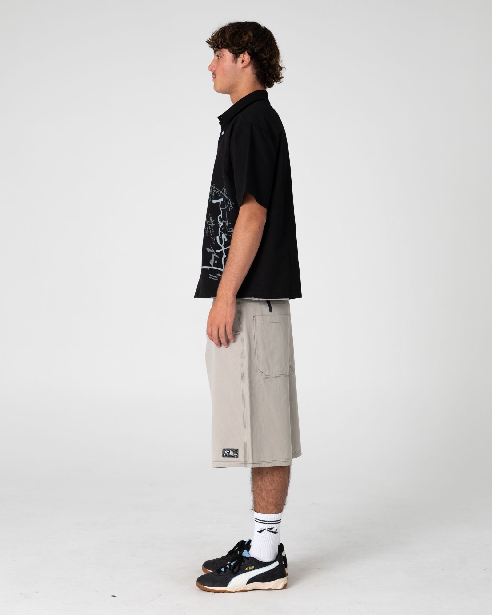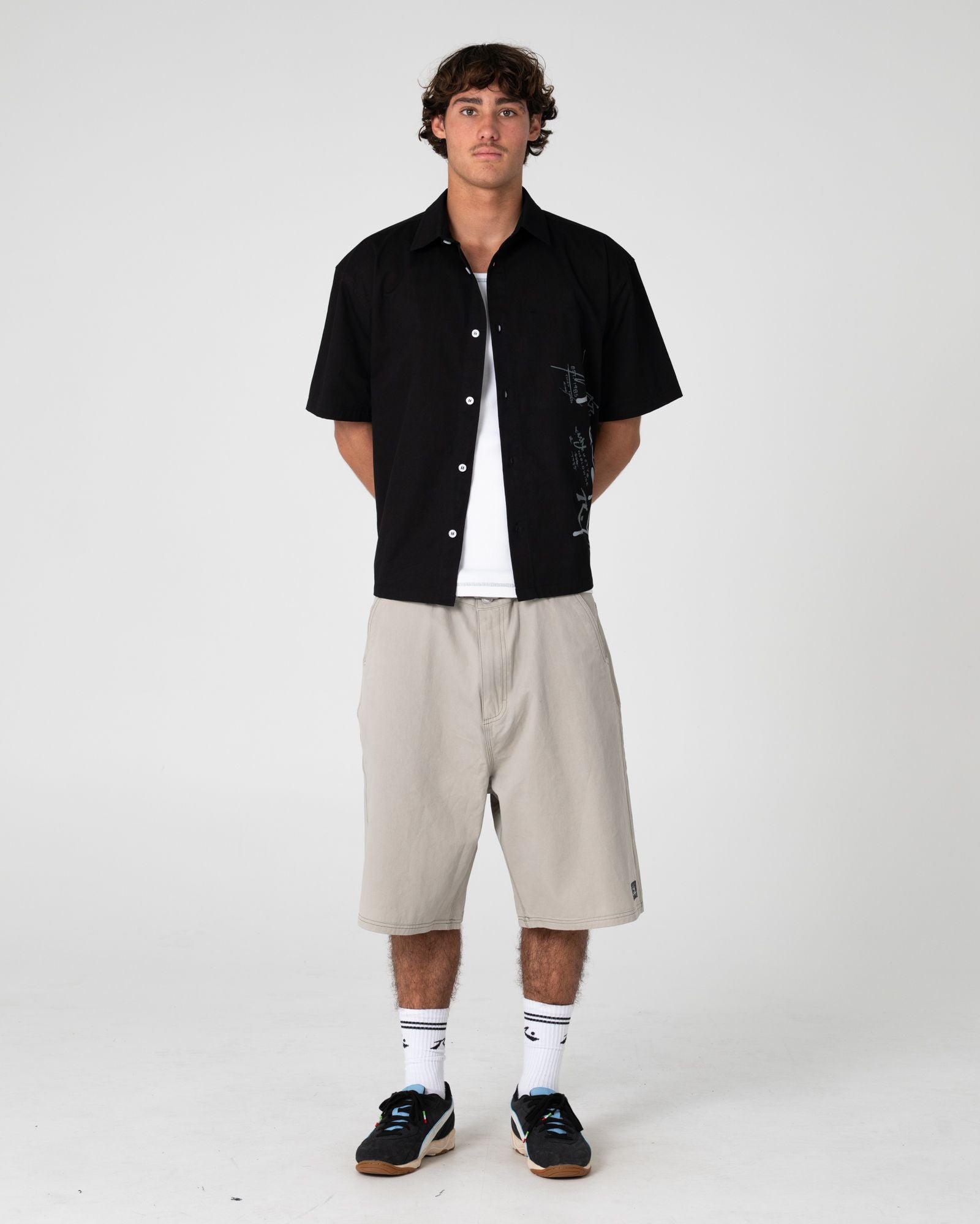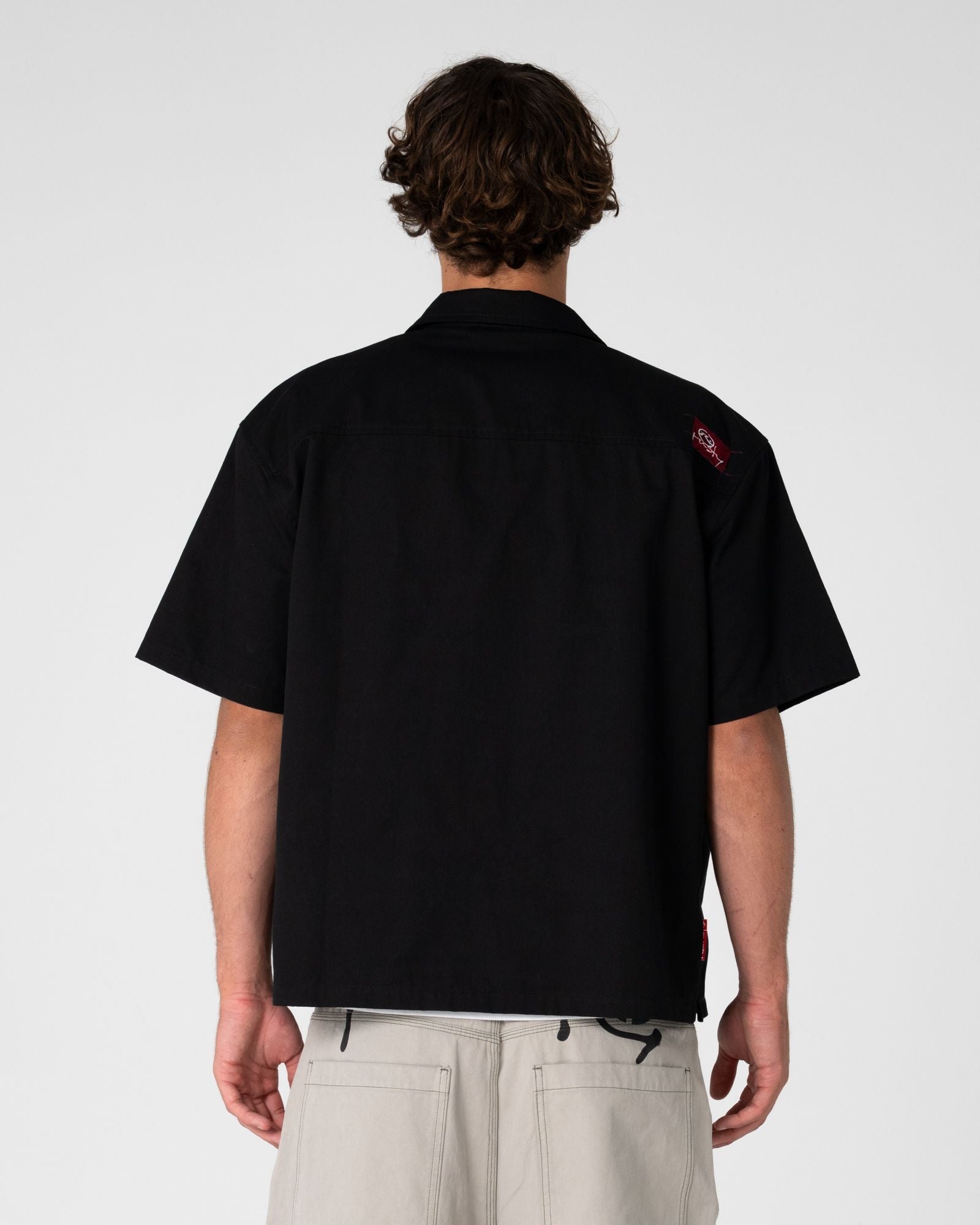 Cropped Fit Shirt With Rusty Placement Print On Front And Wocen Label On Back Yoke. 100% Cotton Light Weight Twill